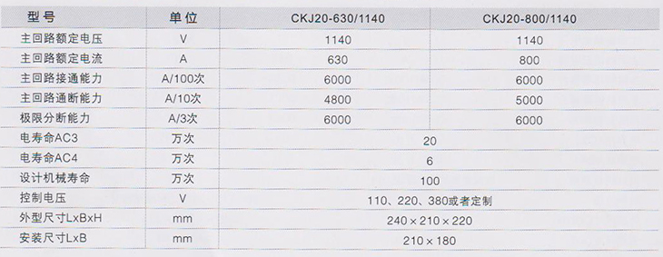 CKJ20-630(800)/1140型交流低壓真空(kōng)接觸器使用於交流50HZ,主回路(lù)額定工作電壓到1140V,額定工作電流至600A的電(diàn)流係統中,供遠距離接通與開斷電路及頻繁地起動和控製交流電動機用。並適宜於與各種保護裝置組成磁力(lì)啟動器,具有電弧(hú)不外露等特(tè)點。特別適用於組(zǔ)成防爆磁力啟動(dòng)器。適(shì)用於煤礦或石油等行業。