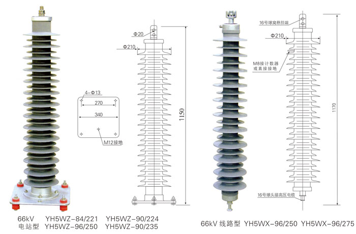 出(chū)口 66KV電站型(xíng) YH5WZ-84/221 YH5WZ-90/224 YH5WZ-96/250 YH5WZ-90/235 66KV 線路型 YH5WX-96/250 YH5WX-96/275